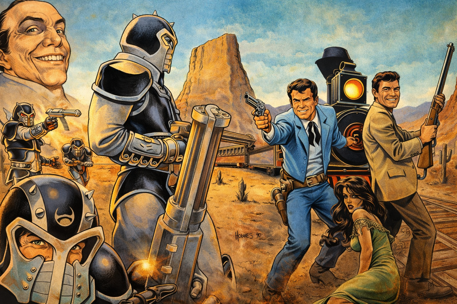 Avant même l’explosion du western italien, certaines séries annonçaient déjà ce changement. Dans Les Mystères de l’Ouest, le western se mêle à la science-fiction, au fantastique et à l’humour noir.