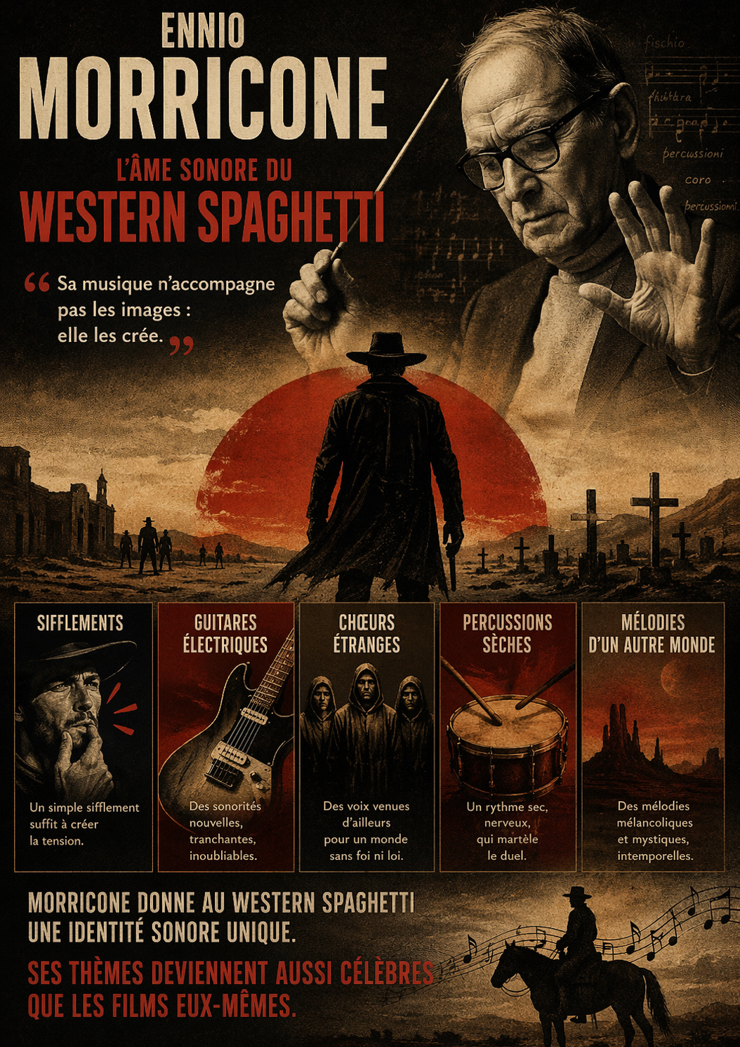 Morricone donne au western spaghetti une identité sonore unique. Ses thèmes deviennent aussi célèbres que les films eux-mêmes.