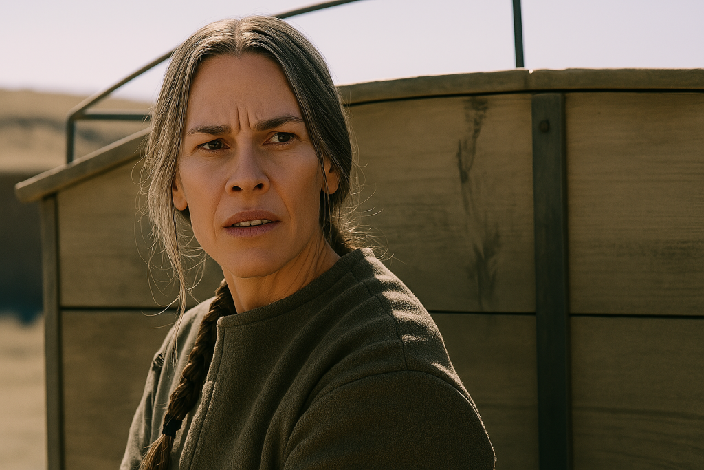 Dans The Homesman (2014), Hilary Swank joue Mary Bee Cuddy, une pionnière solitaire qui traverse les plaines pour sauver des femmes internées.