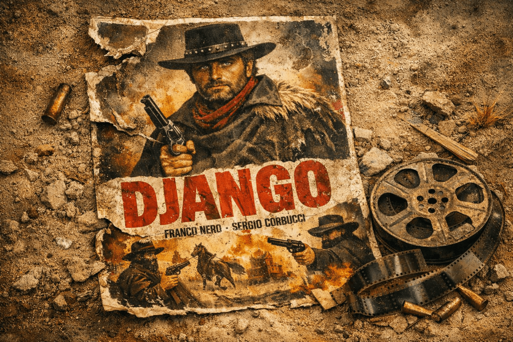 Tellement marquant, en fait, que son sillage a inspiré une véritable avalanche de films apocryphes ou semi-officiels, réutilisant le nom Django dans leurs titres — parfois avec d’autres acteurs, d’autres intrigues, mais toujours cette même figure de l’homme seul face à un monde pourri.