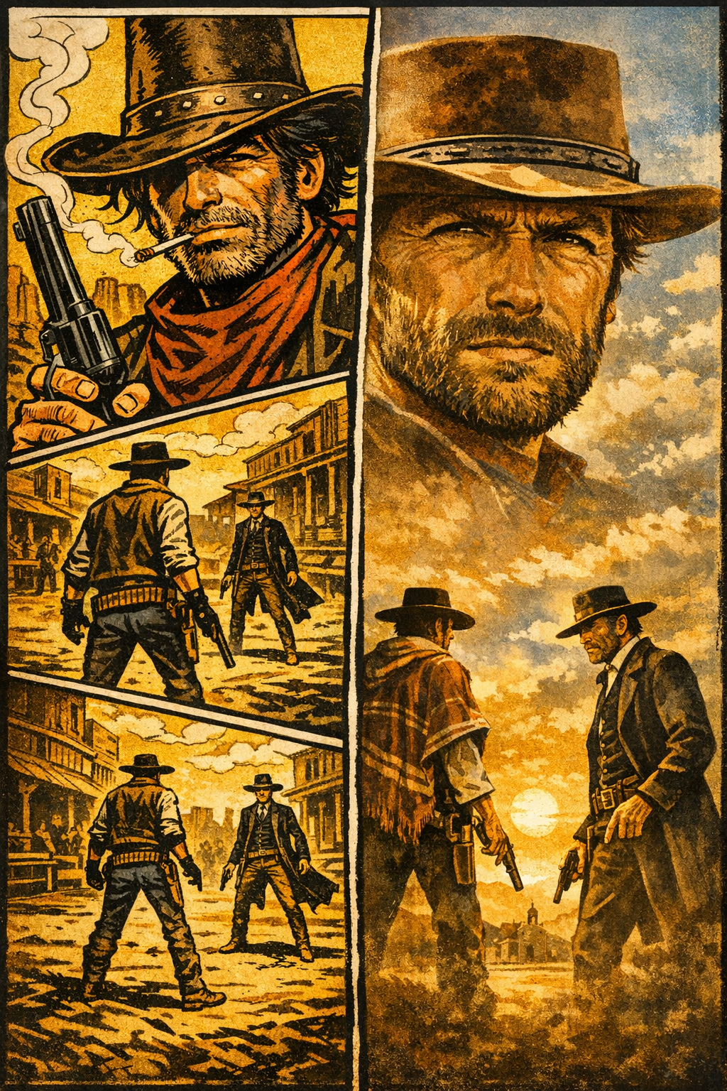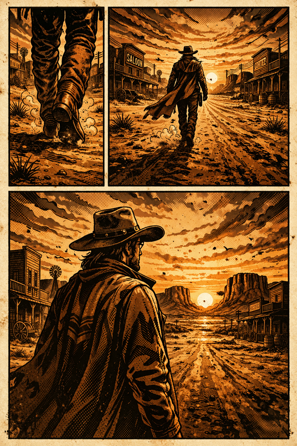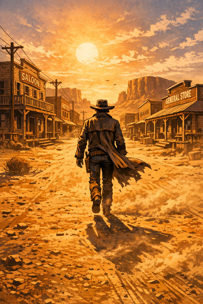 Le soleil se couche. La rue est vide. Quelque part, un personnage s’éloigne. Ce n’est plus forcément un cow-boy. Ce n’est plus forcément un héros.Mais c’est toujours une histoire de western.